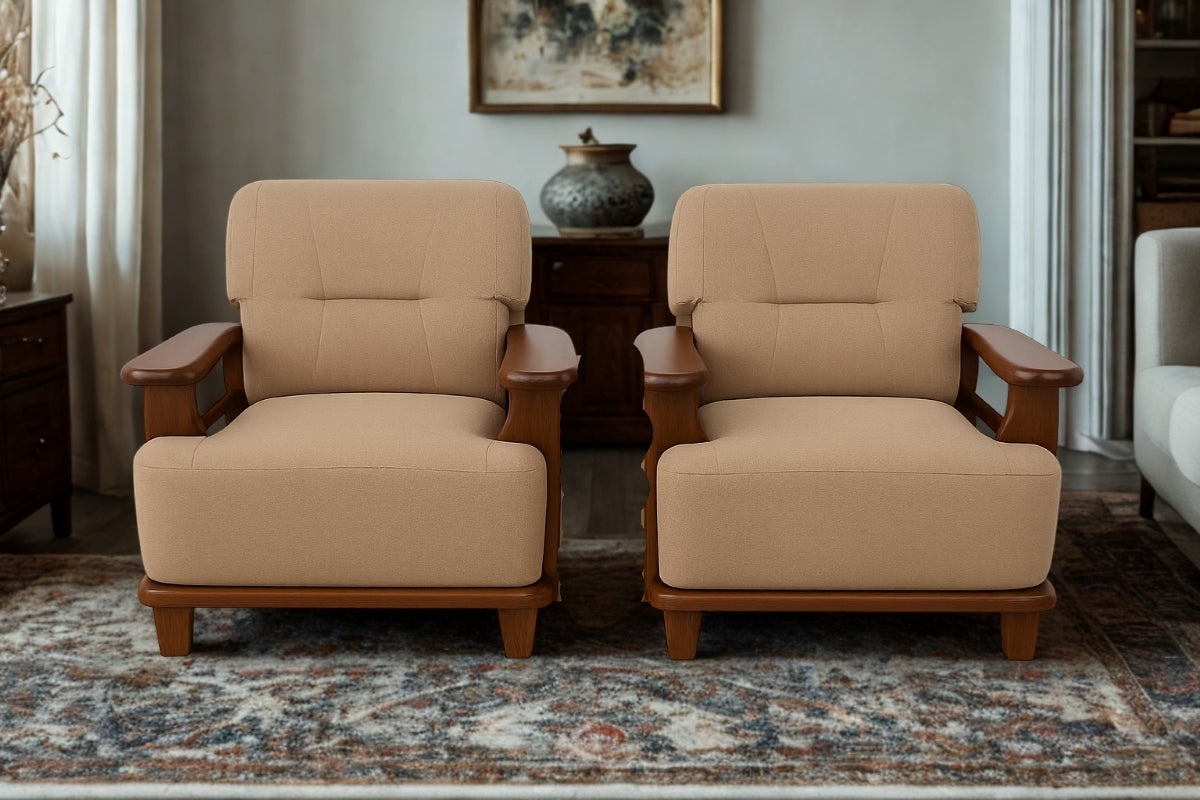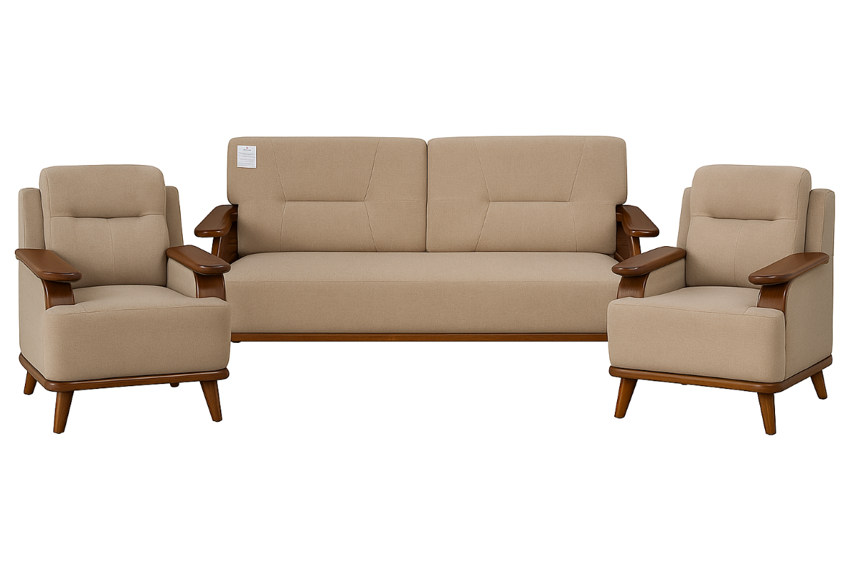 Bring home the charm of tradition blended with modern design with the Elevate Heritage 3+1+1 sofa set. Upholstered in soft beige fabric with sturdy wooden armrests, this set combines durability, elegance, and everyday comfort.